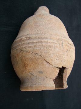 | Description / विवरण | This is an elongated shaped pot which is having featureless rim, projected base and elongated belly. On the belly it is having three horizontal lines. It is containing fine fabric, also it is wheel made well fired |