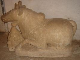 | Description / विवरण | Independent sculpture of Nandi, who is depicted sitting on pedestal and facing right. His head is intact with sharp eyes made by incised line, nostril made with two holes and mouth with vertical lines. Horns and ears on both side of head, depicted with neck body with hump and two bent forelegs. Neck is decorated with Ganti Tail can be seen at back. Laddus are shown in front of him. |
