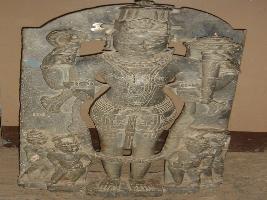 | Description / विवरण | Independent sculpture of four armed Vishnu in standing position. Attributes from right below 1 broken from elbow 2 chakra but half broken 3 mace 4 broken from elbow. He is wearing a Kirita mukuta and a transparent drapery folds of which are clearly visible. He is wearing a banmala which is partially broken. He is face slightly defaced and two couples are seen at his both sides. |