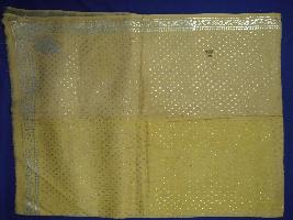 | Description / विवरण | It is a piece of a pale yellow coloured, with silver dotted block print cloth. It has a floral block print silver coloured border. |
