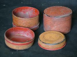 | Description / विवरण | A box with cover having lacquer work in floral and net design all over. Two bowls are placed inside the box. |