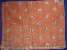 | Description / विवरण | It is thin cotton cloth of faded orange colour with a silver coloured floral motifs alternatively placed. It has a silver block print border of leaves design. There are big floral prints on corners. |