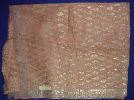 | Description / विवरण | It is a peach coloured thin cotton cloth of silver block print design placed alternatively. It has a silver coloured floral block print design on border. |