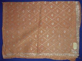 | Description / विवरण | It has a brown coloured thin cotton cloth with dotted square block print. In each square there is a silver coloured floral block print. It also has a silver floral design border. |