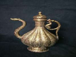 | Description / विवरण | It is a water bottle with a spout, its mouth is of animal s face. There is depiction of ten gods on the main body with floral ornamented creepers over it. The spout and handle also has engraved bird. Perforated cover with ball-bell inside it. |