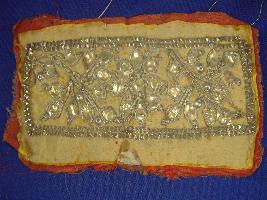| Description / विवरण | Sample of designs on silk yellow in colour and cotton red in colour having floral designs made of jari and silver coloured border. |