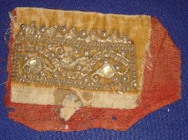 | Description / विवरण | Sample of designs on cloth having floral design of metal on it. It is rectangular in shape. |