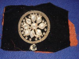 | Description / विवरण | Sample of design on cloth rectangle in shape having floral design on centre of metal on it. This piece of cloth is velvet. |