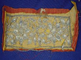 | Description / विवरण | Sample of design on silk yellow in colour and cotton red in colour , having floral designs and silver coloured border made of jari. |