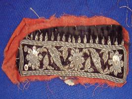 | Description / विवरण | Sample of designs made on velvet and cloth rectangular in shape having floral designs made of jari and sequence. |