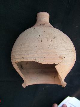 | Description / विवरण | It is a broken globular shaped pot. It is decorated with six horizontal bands. It has a ridge beaded rim. It has a goblet base |