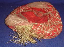 | Description / विवरण | Turban pagri of Marathas having crossed designs over it, made with red cotton thread and golden jari. At the right side there is a piece of hangings of golden colour. A belt also attached with it to fix it on the neck. |