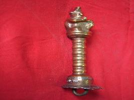 | Description / विवरण | It is a handle of bell. A human sculpture in sitting position is engraved over bell. It also has feathers. There is a long handle below it. |