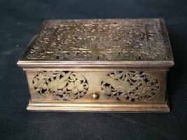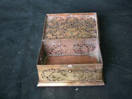 | Description / विवरण | It is a betel box with perforated and engraved design all around. It is carved in rectangular shape, provided with a hollow container and two lids open at both side by a touch key . Wall of the pedestal has floral creepers with bird shown in medallion. Two lids have stylised birds at the edge. |
