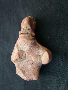 | Description / विवरण | It is a female figurine made of appliqu & notched technique, its head is decorated with a bend, it has a ridged face wide mouth both hands, and lower part of the body is broken it is red slipped. |