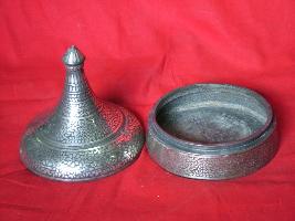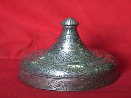 | Description / विवरण | It is a pan box with conical cover. Its base is flat in circular shape. Bidri work is done all over in floral pattern. |