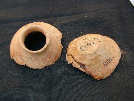 | Description / विवरण | This is a miniature pot which is having featureless rim, globular belly and fine fabric. Besides, it is having painted horizontal line of black and red colour. Also it is having circular, flat base. Now it is split into two parts |