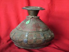 | Description / विवरण | It is a leather and brass hookah with perforated and engraved design. |