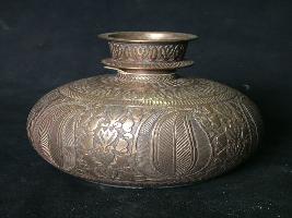 | Description / विवरण | It is a hookah bowl ornamented in Kashmiri design with flowers in alternate vertical bands. It has engraved work. |