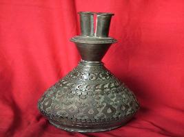 | Description / विवरण | It is a leather and brass hookah with perforated and engraved design. |