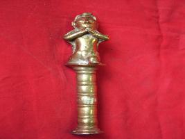 | Description / विवरण | It is a handle of bell. A human sculpture in sitting position is engraved over bell. It also has feathers. There is a long handle below it. |