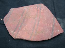 | Description / विवरण | It is a part of a storage jar and well fired wheel made, it has black horizontal line decoration on its body |