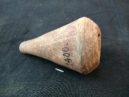 | Description / विवरण | It is a solid conical shaped brown colour painted terracotta object. Its tip is broken, it is decorated with horizontal incised lines as on its base. The top part is broken. The hole has got a cut mark on it. |