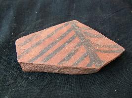 | Description / विवरण | This is a fine fabric pot sherd. It is decorated with black colour on red background. It is decorated with horizontal and vertical line |