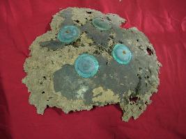 | Description / विवरण | It is a badly damaged shield made of Rhino skin. Four brass knobs are present on surface. |