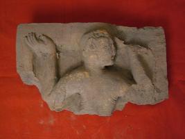 | Description / विवरण | This terracotta plaque showing a male figure bust .His hands are upward touching the borders raised of plaque. |