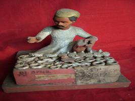 | Description / विवरण | Clay model of a shop of plated jewellery. A man is shown selling jewellry. Dust and dirt has accumulated on the surface. |
