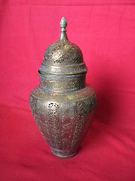 | Description / विवरण | Perforated vase with dominical lid having finial on the top. It has alternate bands in floral designs. Vase is tapering towards the flat base. |
