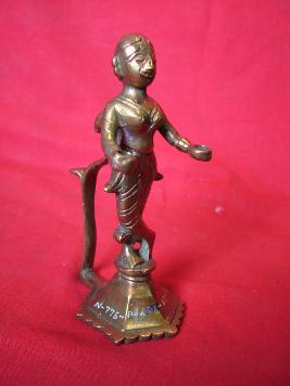 | Description / विवरण | A wick Artika supported with a female figure. It is formed on a pyramidal hexagonal base. An long twisted holder is provided to its back. Not much decoration is done on the sculpture. Object is in good state. |