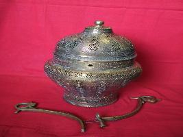 | Description / विवरण | It is a bathroom lamp with upward tapering. It has perforated floral designs alternating with human figures. |