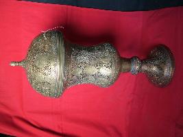 | Description / विवरण | It is a vase with cover having number of medallions with engraved and chased figures. It is set in the midst of floral open work on the bowl and cover. |