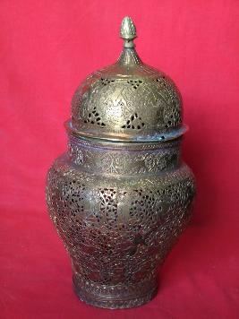 | Description / विवरण | It is a perforated vase with dome shape cover. Perforated vase with dominical shaped lid having finial on the top.It has medallions depicting human figures and mythical animal forms. The perforation is done in spiral design with flowers. |