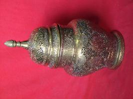 | Description / विवरण | It is a perforated vase with dome shape cover. Its medallions has chased figures in human and mythical animal forms. The perforation is done in spiral design with flowers. |