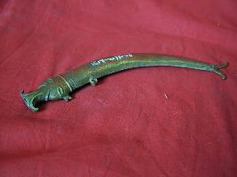 | Description / विवरण | This is a fish shaped antimony holder having a hook. It is engraved with lines. |