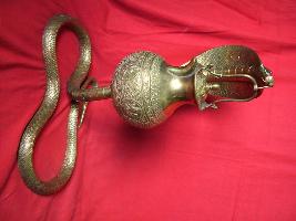 | Description / विवरण | It is a snake in sitting posture carved with open tongue. It is holding a kamandal a water pot having carved mythological figures on it. |