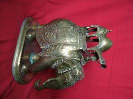 | Description / विवरण | It is an elephant carved and decorated with different ornaments. Its top has architectural designed throne with masand Bolster . Mahavat is seated wearing turban. |