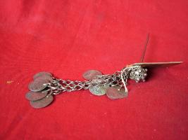 | Description / विवरण | It is a hair pin with chains and circular plates attached to it. Circular plates have Persian inscription inscribed on them. Pin has embossed floral design. |