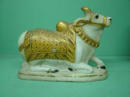 | Description / विवरण | Marble Nandi in seated posture; decorated with colourful cloth in green on its back. Sculpture is in good state. |