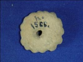 | Description / विवरण | Terracotta bead with cylindrical body and a hole across it. It has incised line design around it forming serrated edges. |