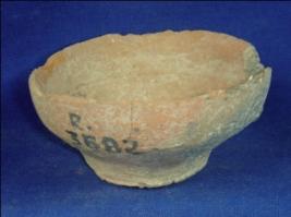 | Description / विवरण | Terracotta bowl with a broad mouth, thick rim and a narrow flat base without any decoration. Wheel marks are visible in the inner surface. A portion of edge is broken. It was probably used as a utensil. |