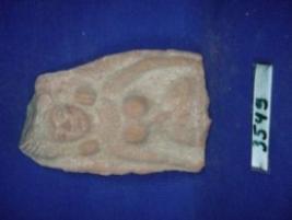 | Description / विवरण | Terracotta figurine of a female in relief. The head has incised eyes and incised mouth. Portion of hair style is visible. The figurine is bedecked with earrings and necklace of incised lines. The right hand is straight and left in akimbo. The portions below hip are missing |