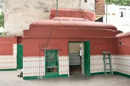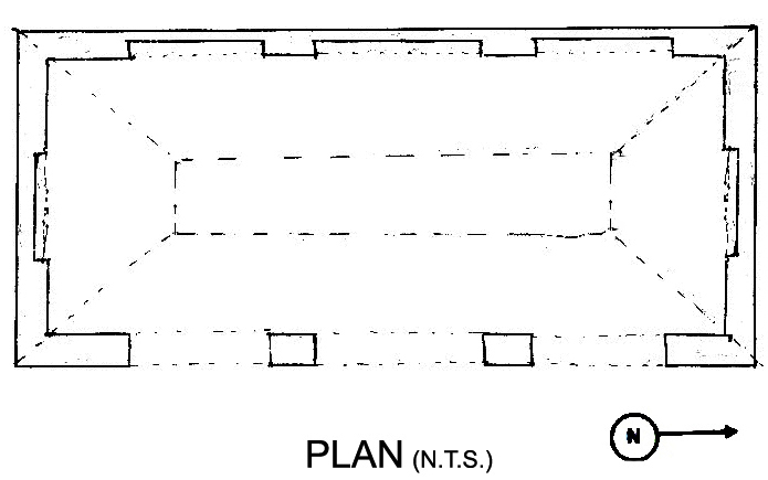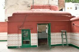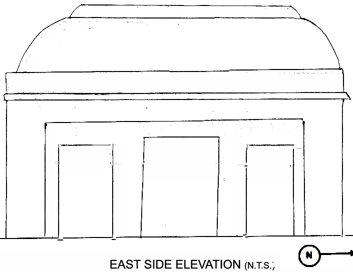 The peculiar single chamber mosque is constructed on a rectangular plan. The building is roofed by vaulted Bengal dome and is crowned with rectangular lotus cresting. It is entered through a trabeate gateway furnished with iron door. Originally it has three openings in which two of them on either side of the present central entrance, has now been converted into windows. The exterior and interior dado is cladded with ceramic tiles.