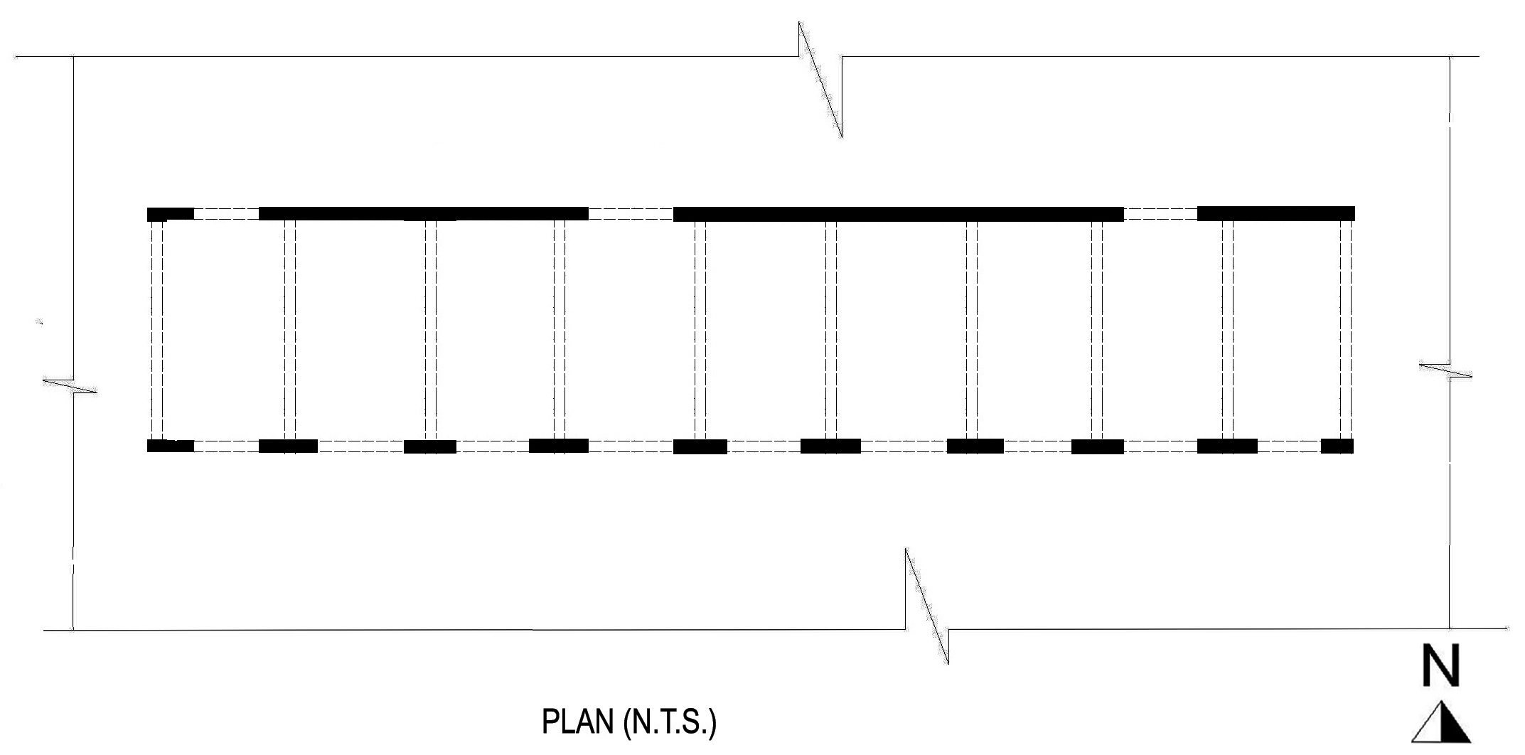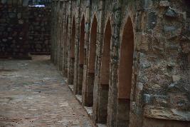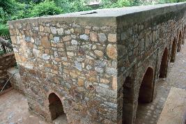 The large rectangular building is a single-storeyed structure and measures approx. 26.5 m by 2.75 m. The structure is partially buried, approx. 2 m can be seen above ground level. It has a flat roof and arched cells on all sides. The facade of the building is interspersed with a series of arched openings.