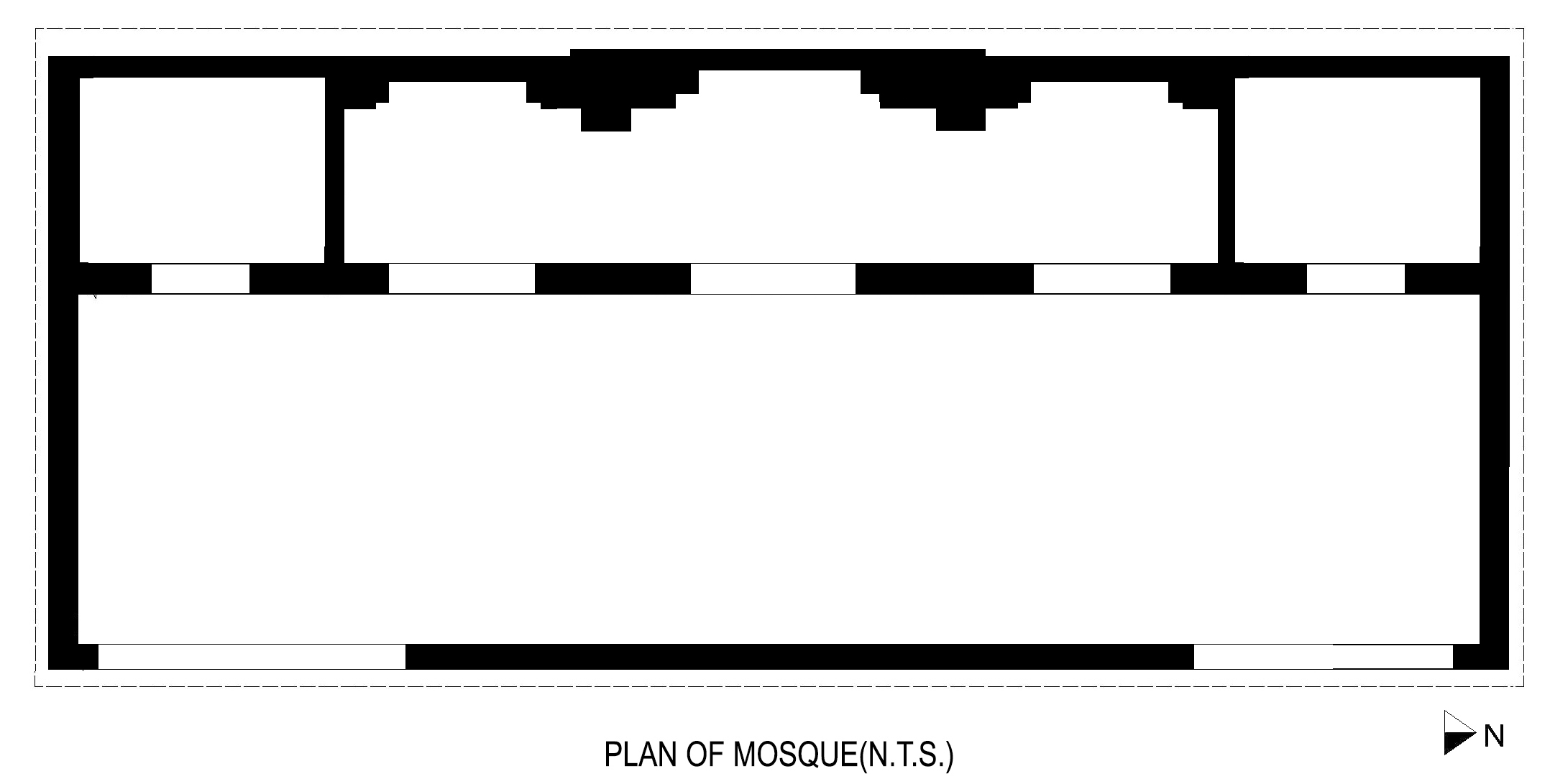 The beautiful mosque is of three bays and entered through a well decorated arched entrance. The facade of the building is in buff-coloured sandstone with floral engravings. All bays are roofed by a flat dome and separated by a pointed arch over which there is a cusped arch. The western Qibla wall has five mihrab recesses. The central mihrab is deep and emphasized by rising of the wall. There are small decorative niches in between the mihrab and arched bays. The mosque is in its original state and painted green and yellow.