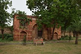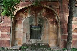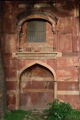 This building is a Mughal style structure. It has a pointed arch over which there is a small arched opening and has a vaulted roof. The facade of the building is highly impressive and is faced with red sandstone inlaid with traces of flawless white marble. There is a beautiful jharokha like openings on either side of the arched openings, at the upper floor level, while arched recess at the lower level.