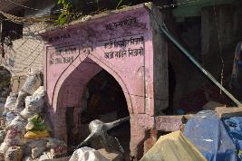The small gateway has pointed arched openings and a chajja runs along its eastern facade. There is a floral motif in the center above the arch,is incised in plaster. It is painted pink.